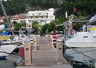 Marina-Alternativen in Fethiye: Classic Hotel Steg und Yes Marina 04.12.2011 Yacht Classic Steg Gleich westlich neben der großen ECE Marina liegt das Yacht Classic Hotel, das auf seiner Seeseite einen langen T-Steg hat, an dem bis zu 20 Yachten mit Murngleinen festmachen können. Die Anlage liegt zehn Minuten zu Fuß vom Statzentrum entfernt und ist ganzjährig geöffnet.