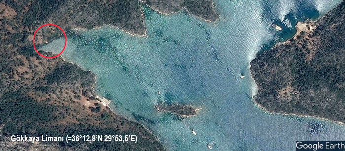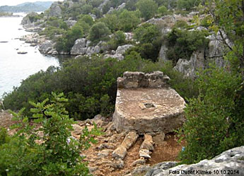 ![]() Segler Klimke war im Oktober diesen Jahres an der türkischen Südküste unterwegs und stieß bei einem Landgang auf die Überreste eines Dorfes in der Bucht Gökkaya. Die Ruine einer alten Kirche ist noch zu erkennen, ein paar Wände von Häusern stehen noch (eine genaue Lagebeschreibung folgt weiter unten). Mitten auf dem Wanderweg wunderte sich der Deutsche über in eine größere Steinplatte eingeritzte Symbole, die er sich näher ansah. Eine seltsame Konstruktion aus Kreisen und Linien weckten die Neugier des Seglers. Er fertigte eine Zeichnung der Steinplatte an, beschrieb die Lage des Ganzen und setzte seinen Törn fort.