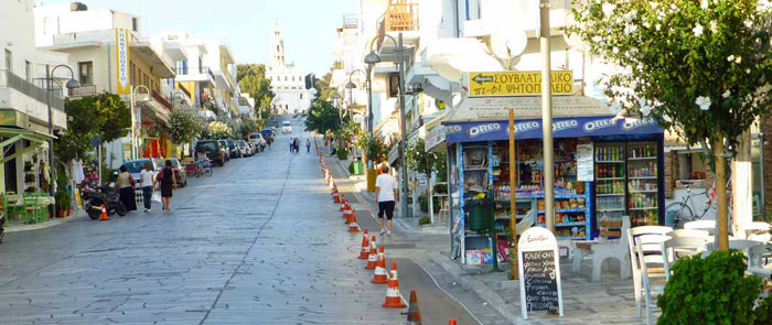 Mittelpunkt des Ortes ist die Wallfahrtskirche Panagia Evangelistria mit einer wundertätigen Ikone. Um in den Genuss dieser Wunder zu kommen, muss man als Gläubiger allerdings die 500 m vom Hafen hoch zur Kirche auf den Knien rutschen. Deshalb sieht man - vor allem an Wochenenden - zahlreiche Pilger (und vor allem Pilgerinnen) auf der extra von der Haupstraße durch Gummihütchen abgetrennten und teppichbelegten „Kriechspur“ nach oben rutschen. In unzählichen Devotionalienläden gibt es dazu passende Amulette, meterlange Kerzen und kleine Plastikbehälter für ein paar Kubikzentimeter Wasser aus der heiligen Quelle: Lourdes auf Griechisch-Orthodox.