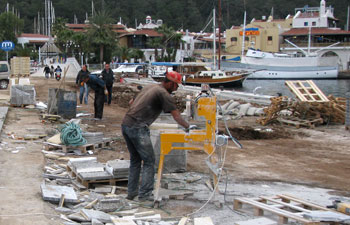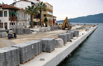 Die elegante Sommer-Cafe-und-Restaurant-Promenade ist eine Baustelle Im letzten Winter war im Hafenort Marmaris Lärm und Staub angesagt. Schwer beladene Laster fuhren da wo im Sommer die Touristen und Yachteigner prominieren. Bis zum Saisonbeginn soll alles fertig sein. Inzwischen liegen die Yachten und Gulets wieder an der Pier und von den Umbauarbeiten ist nichts mehr zu sehen.