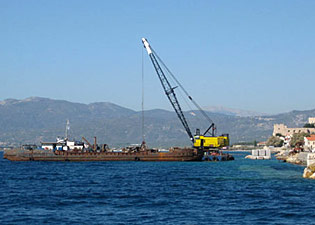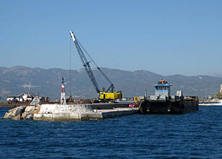 Pythagoreion: Vorsicht vor langen Schwimmleinen Aktuelle Winter-Information 2014/15 von Urs Murbach, SY SAILFISH 23.10.2014 ![]() Der Hafen von Pythagorion ist im Moment praktisch durch die Fähre Venus völlig belegt. Sie liegt wie die Spinne im Netz vor vielen Ankern und Leinen offensichtlich in ihrem Winterlager. Dadurch ist der gesamte Yachtkai unbrauchbar. Vorsicht vor langen Schwimmleinen zu beiden Seiten vom Bug. Baumaßnahmen im Stadthafen von Pythagorion auf Samos 2009 Berichtet von Wolfgang Horn und Barbara Mohn von der ANAHATI II 24.10.2009 ![]() In diesem Sommer konnte man schon beobachten, dass ein Schwimmkran mit den dazu gehörenden Fahrzeugen an der maroden Außenmole des Hafens von Pythagorion gearbeitet hat, um sie zu verstärken. Als wir zum letzten Mal am 10. Oktober 2009 in Pythagorion waren, hörten wir, dass ab Montag, den 12. Oktober der Kai vor den Tavernen und Bars geräumt werden muss, da der Hafen ausgebaggert werden soll. Von Yannis von Samosail und Hugo von Seafarer und dem Tavernenwirt Costas von der Taverne Pythagorion erfuhren wir dann folgendes: 1. Der Hafen von Pythagorion wird tiefer ausgebaggert, allerdings nicht dort, wo die kleinen Fischerboote im Ostteil des Hafens liegen sonderen nur dort, wo die Yachten den Platz beanspruchen also vor den Tavernen und Bars an der Promenade. Der Hafen hatte bisher für uns Yachten eine durchschnittliche Tiefe von vier Metern und der Ankergrund war ausgesprochen gut, unsere Anker hielten immer. Hoffen wir, dass es nach dem Ausbaggern auch noch so ist.