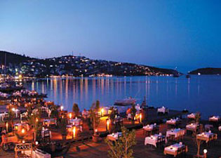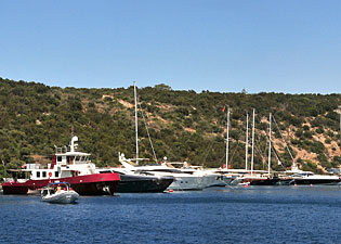 Am Westufer wurden alle Badeplattformen entfernt und Sandstrand aufgeschüttet, die Plattformen am Nordufer sind geblieben. An den mit Polstern, Tischen und Stühlen ausgestatteten "Steginseln" darf man nicht festmachen die Restaurants sind ausschließlich auf Landgäste eingestellt, die Yachten als Störung empfinden. Entsprechend exklusiv und teuer sind die Bars und Hotels an der Nordseite der Bucht. Wer unbedingt hier bleiben will, weicht in die südöstlich anschließende Bucht Gölköy aus. Dort gibt es Platz zum Ankern auf Sandgrund, am besten in der Ecke im Ostteil vor der Ruine einer alten griechischen Kapelle. Bei Meltemi steht kräftiger Schwell herrein. Die Restaurants am Ufer sind weniger "fashionable" wie die in Türkbükü. |