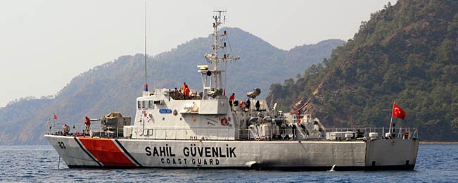 Gleiches gilt für den Rauschgiftschmuggel. Darüberhinaus kontrolliert die Sahil Güvenlik den Großsschiffsverkehr in den Durchgangsgewässern des Marmarameeres und des Bosporus zum und vom Schwarzen Meer. Eine weitere Aufgabe ist die Kontrolle der Yachten. Auf der Checklist stehen folgende Positionen: 1. Transitlog 2. Pass/Personenüberprüfung 3. Sicherheitsausrüstung (Rettungsmittel, insbes. Feuerlöscher, Branddecke etc.) 4. VHF Geräte 5. Beleuchtung 6. Qualifikation des Skippers. Die Vorfälle, bei denen die Küstenwache zu informieren ist, sind: 1. Seenotfälle 2. Meeresverschmutzung 3. Menschenschmuggel 4. Illegale Fischerei und Tauchen 5. Terroristische Aktivitäten. Es sollen englischsprachige Ansprechpartner zur Verfügung stehen. Die Küstenwache sendet dreimal am Tag (jeweils 8.00, 13:00 und 18:00 Uhr) auf Kanal 8 (Ankündigung auf Kanal 16) einen regionalen Wetterbericht in türkischer und englischer Sprache.