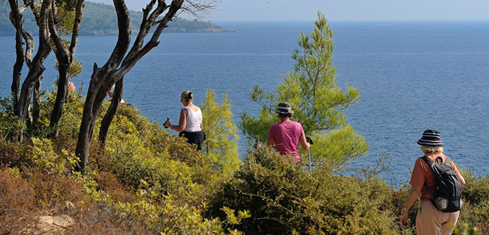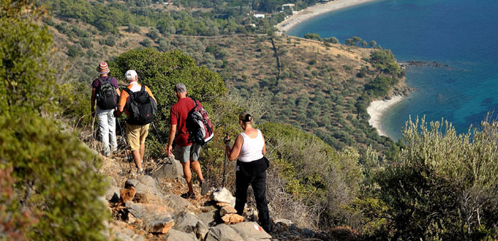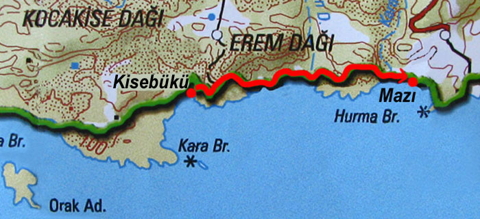 Die byzantinischen Ruinen, die sich über den langgestreckten Kieselstrand verteilen, haben wir bereits am Vorabend erkundet und ein herrliches Bad genommen. Nach dem Frühstück an Bord sind wir - eine Gruppe von 9 Segel-/Wanderfreunden - bereit zum Aufbruch. Unser Ziel ist der etwa 10 km östlich gelegene Strand von Çakilliyali (zu deutsch: Kieselstrand), die westlichste der drei Buchten, die zum Ort Asiagi Mazi gehören. Dort soll unsere Gulet uns ab dem Mittag erwarten.