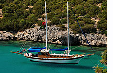 Und dann - tatsächlich! - tief unter uns liegt unsere Gulet wartend vor Anker! Wir reißen uns von dem atemberaubenden Panorama los und machen uns an den steilen Abstieg. Beschwingt von der Aussicht auf den nachmittäglichen Tee an Bord vergeht er uns wie im Flug. Fünfeinhalb Stunden hat der Ausflug gedauert. Natürlich mit Pausen, aber keineswegs gemächlich geschlendert! Beim wohlverdienten Schwimmen erholen die Füße sich vom felsigen, unebenen Gelände.