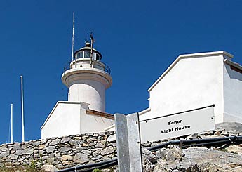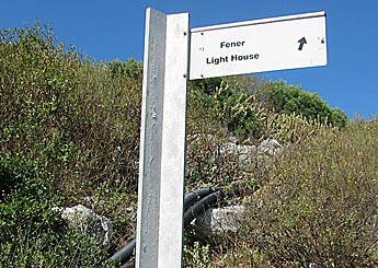 Nach etwa 10 Minuten erreicht man das einzige Hinweisschild auf der Wegstrecke, das mit einem schlichten Pfeil zum "Fener" bzw. dem "Light House" weist. Normalerweise. Denn als wir dort im letzten Sommer vorbei kamen, zeigt das Schild nicht Richtung West, sondern den steilen Berg hinauf.
