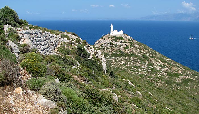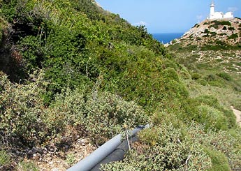 Hinunter ging es leichter als hinauf. Unten angekommen richteten wir das Hinweisschild, das offenbar ein Schelm in die falsche Richtung gedreht hatte, neu aus und drehten es zum Leuchtturm hin. Der Richtung folgende zeigte sich auch ein weiterer Hinweis, nämlich eine doppelte Rohrleitung, die teils unter Maccia verborgen, teils offen sichtbar in Richtung Leuchtturm verlief. Ihr folgten wir und erkannten bald darauf einen gut ausgetrampelten Pfad, dem wir vertrauten. Nach weiteren 30 Minuten mit einer kurzen bergan Strecke standen wir beim Light House und konnten den gigantischen Blick über das Meer bis nach Kos und zur griechischen Vulkan-Insel Nysiros und der daneben liegenden weiß leuchtenden Bimsstein-Insel Yali genießen.