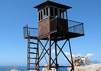 Nichtsahnende folgten wir dem Hinweis und kraxelten bergan, davon überzeugt, der Steig führe erst nach oben und von dort auf verschlungenem Pfad nach Westen. Als wir endlich droben ankamen, standen wir nicht vor dem Leuchthaus, sondern vor dem halb verfallenen und ziemlich verrosteten Militärwachtturm aus Zeiten des Zypernkonfliktes. Offenbar bewachten Soldaten damals auf ähnlichen weit über dem Meer installierten Türmen die Küste gegen kampflustige Helenen (!). Einen ähnlichen Turm gab es bis vor wenigen Jahren noch auf der Halbinsel bei Gümüslük und an anderen ins Meer hinaus ragenden Kaps.