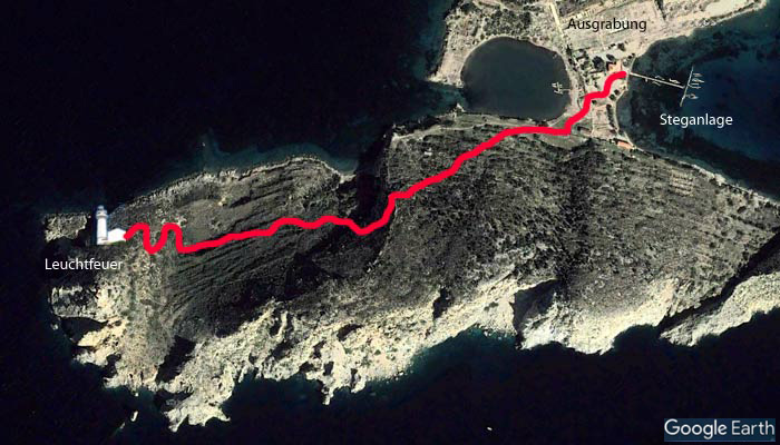 Im Grunde ist der Weg nicht zu verfehlen. Das Ziel, der Leuchtturm, ist immer gut voraus zu sehen. Man verlässt den Steg und hält sich links ein Stück am Strand und am Haus der archäologischen Gesellschaft entlang und folgt auf etwas ansteigendem Gelände parallel dem verlandeten sogenannten Kriegshafen aus antiker Zeit.