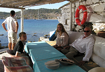 Als wir dann endlich die Frauen mit den Kindern schon fast im Tal wieder unter einem Baum rastend eingeholt hatten, waren alle froh. Endlich wieder unten angekommen zogen wir sogleich ins Loryma-Restaurant. Vor dem guten Essen gab es erstmal ordentlich was zu trinken. Bekir ging es nicht so gut, er hatte Kopfschmerzen und sich wegen der fehlenden Kopfbedeckung wohl einen kleinen Sonnenstich geholt. Trotzdem ließ er es sich nicht nehmen, für jeden einen Teller Spaghetti und Getränke nach Wunsch auszugeben.