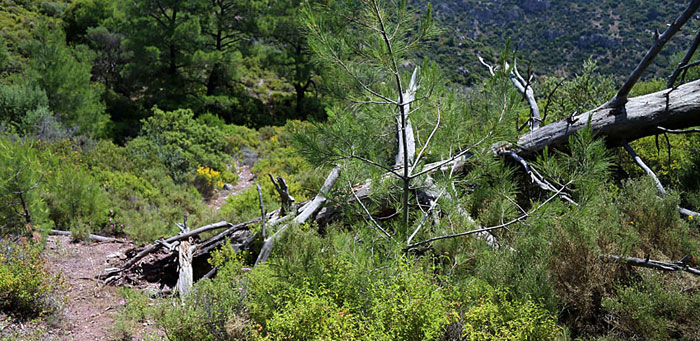 Nach weiterem Anstieg haben wir den höchsten Punkt des Strecke erreicht. Wir machen Pause und sitzen unter schattigen Pinien auf dem Waldboden, trinken Wasser aus den mitgenommenen Flaschen und essen unser aus der Ova-Bäckerei mitgebrachtes Käsebrötchen. Position: N 36°41.02.1 E 27°32.32.29, Höhe 217 m Um 11:32 ist die Pause vorbei und es geht weiter.