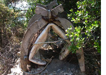 Jetzt sind wir 187 m hoch in dichtem Gestrüpp, Position: N 36°41.05.5 E 27°32.36.9 Kurz darauf finden wir mitten in einem weiten Hang auf einmal keine Markierung mehr, weit und breit kein Rot-weiß! In welche Richtung geht es weiter? Sollen wir auf gut Glück den Hang traversieren und hoffen, dass wir den Weg im Gestrüpp irgendwo finden? Das könnte riskant sein, uns irgendwo hin führen, wo es weder vorwärts noch zurück geht. Wir suchen und finden überall nur Suhlkuhlen von den unsichtbaren, aber offenbar allgegenwärtigen Wildschweinen. Wir denken an gestern und beschließen gut aufzupassen, damit wir nicht plötzlich vor einem wilden Eber stehen. Durch Zufall finden wir dann aber doch wieder die Markierung. Ab jetzt geht's leicht bergab, das kratzige Gebüsch wird lichter und ab und zu erhaschen wir ein Durchblick auf die weite Bucht mit dem langen Strand von Palamut. Wir sind den 4. Tag unterwegs. Man merkt es an der Kondition: sie ist stabiler und wir laufen beständiger. Vor zwei Tagen hatten wir versucht einen ummarkierten Pfad nur nach Buchangaben (Carla Winkler: Wandern zwischen Ägäis und Mittelmeer auf der Datça-Halbinsel) zu erkunden und waren irgendwo in der Macchia stecken geblieben, mussten schließlich umkehren und den selben Weg zurück marschieren. Hier auf dem Carian Trail dagegen ist die Orientierung eindeutig besser bis auf die wenigen Ausnahmen.