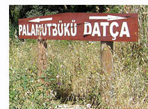 Das letzte Stück ist ein kleiner Horrortripp: es geht über ein tief abfallendes Geröllfeld steil hinunter. Man rutscht, die Knie zittern, die Füße suchen Halt das ist verdammt anstrengend. Beginnt man in Palamut um nach Hayitbükü zu laufen, kriegt man vermutlich nach dieser ersten Steilsteigung einen Krise und denkt, dass es immer so weiter geht. Aber weit gefehlt: nur das erste Stück ist so steil und mühsam, danach ist der Pfad moderat und sehr gut machbar. 12:55: Wir sind unten auf der Straße nach Palamut. Die Frau vom ersten Haus unmittelbar nach dem Steilhang lädt uns zum çay ein, lacht zahnlos, schüttelt uns die Hände, und ruft ihren großen schwarzen Hund zurück, der auf uns zugestürmt kommt: Korkma, korkma!, damit meint sie uns, wir sollen uns nicht fürchten. Das gesamte Stück von Domuzçukuru bis Palamut ist zu lang für einen Tag. Es empfieht sich in Hayitbükü Station einzulegen. Im Buch wird die Strecke mit 17,5 km angegeben und mit einer Laufzeit von 7,5 Stunden. Wir brauchten 5,5 gestern und 3,5 heute, zusammen 9 Stunden. Die nächste Etappe von Palamut nach Knidos ist noch länger: 18,4 km und wird mit 8 Stunden angegeben. Wir meinen, dass dies nur für "strong walkers" an einem Tag zu machen ist. Wer nicht ganz so gut zu Fuß ist, sollte ein Zelt dabei haben oder sich von Boot oder Yacht in einer der Buchten wieder aufpicken lassen. Bei den vorherrschenden Nordwestwinden sollte dies keine Problem sein. Phantastisch ist dieser Abschnitt auf jeden Fall. Und als Ziel lockt die antike Stadt Knidos.
