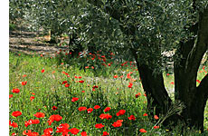 Der Blick schweift über das offene grüne Tal mit den weit auseinander gesprenkelten alten Steinhäusern zwischen Oliven- und Pinienbaumgruppen. Der Wind fächelt Kühle vom Meer heran, Temperatur um die 25°. Wir erreichen das Dorf Mesudiye mit seinen schlichten alten Häusern, wenige aus Naturstein, die meisten in der typischen Betonbauart. Linkerhand passieren wir eine Moschee mit schlankem Minarett neben einer alten, verlassenen Schule mit eingeworfenen Fensterscheiben. Kurze Zeit später wieder eine rechtwinklige Abzweigung nach Norden. Einige alte Männer, die uns freundlich mit "Merhaba" und "Günaydin" begrüßen und zurückwinken kommen uns entgegen. Wir laufen durch den Ort bis die Straße an einem Brunnen endet und der nach rechts abzweigende Schotterweg gemächlich ansteigt. Wir folgen ihm bis wir uns prompt verlaufen haben. Eine Frau winkt von ihrer Terrasse und ruft einem Mann zu, der uns armschwenkend entgegen kommt und gestikulierend klar macht, dass wir ein Stück zurück und dann nach rechts in Richtung der hohen Pinien abbiegen müssen. Das rote X, das „Stop, nicht weiter!“ war aus der Perspektive von unserem Weg aus nicht zu sehen. Hier fehlt ein sichtbareres Signal für die Wegabbiegung. Eine andere alte Frau erscheint vor ihrem Haus und winkt uns kichernd zu, und deutet ebenfalls in die Richtung, in die wir gehen sollen.