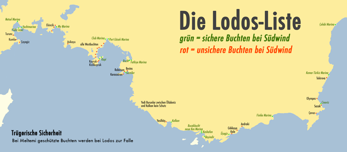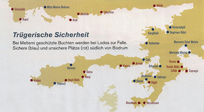 aufsuchen beziehungsweise rasch verlassen. Das sind alle Buchten und Häfen, die gegen den zweiten und dritten Quadranten offen sind. Schutz findet man hingegen an solchen Plätzen, die nach Süden hin von Land umgeben sind.