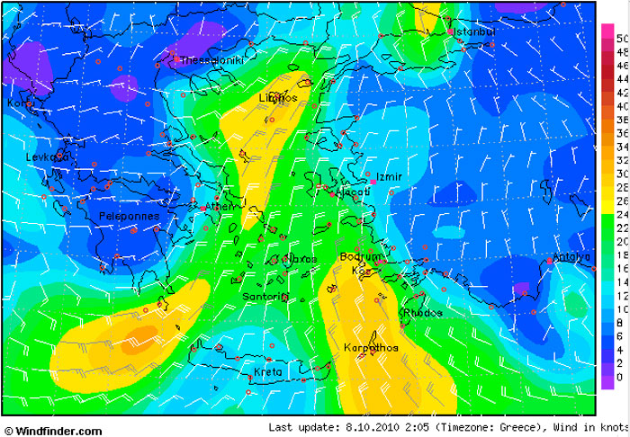 Und hier die Windvorhersage von Windfinder für eine Woche voraus. Klicken ins Bild zeigt die aktuelle Windsituation in der Ostägäis. Wählen eines Orte des Wochenvorhersage für das Revier.