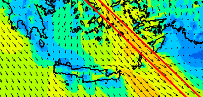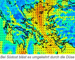 Das Hauptproblem bei einer Planung von Ost nach West oder umgekehrt ist der "Starkwindkorridor", der sich diagonal durch die Ägäis zieht und in dem der Wind meist heftiger als sonstwo in der Gegend bläst. Oben ein typisches Bild vom griechischen Wetterdienst Poseidon. Im Winter ist die Düse des Korridors in umgekehrter Richtung wirksam - siehe Poseidon-Screenshot rechts.