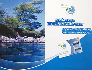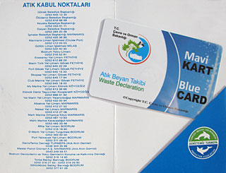 Stand Februar 2012: Ab 2012 soll es nun doch ernst werden mit dem Mavikart-System (auch Blue Card) in der gesamten Küstenregion des Bezirks Mugla, also zwischen Güllük nordwestlich von Bodrum einschließlich Marmaris und Fethiye mit den dazwischen liegenden Golfen und Buchten. Bei jedem Grauwasser-Absaugen und Müllentsorgen muss der Schiffsführer die Mavikart vorweisen, damit das Ereignis elektronisch bestätigt werden kann.