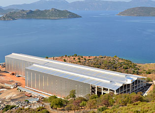 Halle für Superyachtbau in Bozburun steht 28.6.2011 Othmar Karschulin: "Der Großkatamaran ist schon wieder weg. ABER sie haben dort Tabula Rasa gemacht und die großen Hallen hinten weggerissen, um eine Megahalle für die neue 141 m Superyacht zu bauen. In der Halle stehen bereits die Mallen zur Kiellegung bereit. Und das alles wurde in zwei Monaten hingestellt. Ich bin sprachlos. Die Yacht soll komplett aus Birmateak gebaut werden. Geschätzte Bauzeit vier Jahre. Der Innenausbau findet dann angeblich in Holland statt. Werde sicher noch öfters nach Bozburun fahren und berichten wie es weiter geht. Othmar: contact@multihull.de"