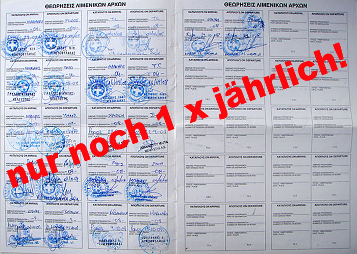 ![]() Stempeln nur noch jährlich 25.12.2014 Jeder Griechenland Segler kennt es, doch kaum einer nutzte es regelmässig: das sogenannte "Private Pleasure Maritim Traffic Dokument“ oder griechisch kurz "DEKPA“ genannt. Es sollte ursprünglich in jedem Hafen abgestempelt werden, doch nun reicht einmal jährliches Stempeln, so Jürgen Rollhäuser von der Kreuzerabteilung in Athen. Anlass für die Nachfrage waren Berichte an die Kreuzer Abteilung, dass offenbar jedes Hafenamt seine eigene Regelung hat: Der eine will es sehen und eintragen, der nächste nicht. Wir vom "Insider" fahren seit Jahren praktisch ohne Stempel einzuholen, obwohl das Dokument an Bord ist. Beim Gang zum Hafenmeister ist es zwar immer dabei, aber nur ganz selten wurde es näher oder überhaupt geprüft. Doch nun ist es offiziell, dass das mehrfache Abstempeln überflüssig ist, denn Joachim Rollhäuser hat beim zuständigen Ministerium nachgefragt. Der Stand ist folgender: „(...) Das DEKPA wird von den Behörden des ersten griechischen Hafen ausgestellt, den ein Boot anläuft, ausgestellt.“ Also zum Saisonbeginn bei der ersten Einreise einen Stempel abholen, danach ist Ruhe.....