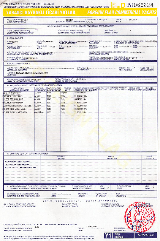Transitlog nur noch über Agenturen und via Internet Juni 2009 Seit 2013 muss bei der Ausreise entweder das Transitlog der letzten Einreise in die Türkei beim Zoll vorgelegt werden oder das genaue Datum der Einreise mitgeteilt werden. Es geht dabei darum nachzuweisen, dass die Yacht unter ausländischer Flagge nicht länger als die erlaubten 5 Jahre im Land ist.