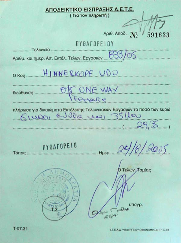 Zöllner in Phytagoreion kassieren extra - keiner weiß für was? 14.10.2005 Hallo, ich möchte Sie über einen Vorfall informieren, den Sie vielleicht veröffentlichen sollten, um andere Segler zu warnen. Der Sachverhalt: Von meinem Jahresliegplatz Kusadasi fuhr ich am 15.09.05 nach Phytagoreion, Samos. Ordnungsgemäß setzte ich die gelbe Flagge und meldete mich bei den Behörden. Der erste Weg führte mich zur Passpolizei, wo die Pässe registriert wurden. Von dort wurde ich an den Zoll verwiesen. Die von der Zöllnerin gestellten Fragen waren verständlich und angebracht. Nach ca. 20-minütiger Prozedur (Ausfüllen mehrerer Formulare und Eintragung in zwei große Bücher), wurde mir eine Quittung zugeschoben, Betrag - man höre und staune: knapp 30 EUR! Weshalb und wofür war nicht zu ergründen. Anschließend zahlte ich bei der Coast Guard noch die üblichen 15 EUR Einklarierungsgebühr, da ich bereits ein Pleasure Craft Traffic Document hatte, sowie die 88 Cent (!) für den Abfahrtstempel. Das war's. Kritisch sehe ich die Gebühr von knapp 30 EUR an den Zoll. Eine solche Gebühr wurde bisher noch in keinem anderen Einklarierungshafen erhoben. Ich habe keine Ahnung für was diese Gebühr sein soll. Nebenbei: Man wird in Griechenland als kleiner Segler ja behandelt, als würde man unter Polizeiaufsicht stehen. Lange Berichte könnte ich Ihnen geben. Ganz besonders schlimm ist und war es immer in Chios, wo man darauf bestand, dass das bei der Cost Guard abzugebende Pleasure Craft Traffic Document erst unmittelbar vor dem Auslaufen wieder zurück gegeben werden könne. In meinem Fall war das um 4:00 Uhr morgens! Dazu war auch noch eine Taxifahrt von der neuen "Marina" in die Stadt und zurück erforderlich. Mit freundlichen Grüßen Ihr E. P. Hier noch ein nahezu gleicher Bericht von Skipper M. U. aus Neuss: Hallo, Herr Hinnerkopf, vielleicht noch eine kleine Ergänzung zu Ihrem Artikel über den kleinen Grenzverkehr zwischen TR und GR. Wir haben diesen September in Samos einklariert. Port Police, Hafenmeister etc. waren völlig problemlos. Leider haben wir auf den sehr netten Beamten der Costguard gehört und sind auch noch beim Zoll vorstellig geworden. Eine äußerst arbeitsunlustige Dame benötigte für die Zollformalitäten der Crew, die vor uns dran war, fast eine dreiviertel Stunde. Dabei baute sie eine bürokratische Hürde nach der anderen auf. Der Gipfel: Für ihre "Bemühungen" knöpfte sie der Chartercrew (5 Personen), die aus der Türkei gekommen war, 48 EUR ab. Bei uns (Eignerschiff, 2 Personen) kam sie mit "nur" 25 Minuten aus und kassierte 30 EUR. Nach der Rechtsgrundlage befragt, konnte sie sich auch nach mehrmaligem Insistieren nur auf "regulations" rausreden. Nachdem ich zähneknirschend bezahlt hatte, drohte sie noch eine Schiffsdurchsuchung an, die allerdings nie statt fand. Mein Fazit: einklariert wird nur noch in Kos oder Patmos. Abschließend noch ein großes Kompliment für Ihre interessante Website, die ich regelmäßig anschaue und der ich schon manche hilfreichen Tipps oder Informationen entnehmen konnte. Mit herzlichen Grüßen aus Neuss am Rhein M.U.