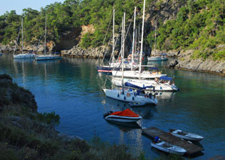 Yachten, die von "draußen" kommen, achten auf die Felsklippen an der südöstlichen Einfahrt der Bucht. Man macht mit einigem Abstand an den Felswänden fest - mit ein bis zwei Leinen, je nach Wind und Richtung. Ali ist jeden Nachmittag mit seinem Dinge unterwegs, um beim Anlegen zu helfen; er bringt die Leinen zum Ufer und macht sie dort fest. Der Platz ist mit Ausnahme von heftigem Winter-Südost gut geschützt.