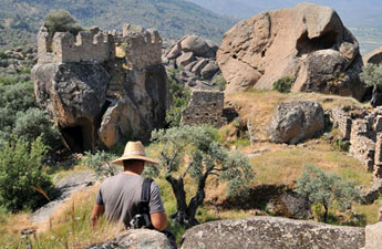 Nach einer weiteren halben Stunde durch schattenspendende Olivenhaine waren wir am Ziel, der Klosterruine Yediler. Yedi bedeutet sieben und soll einen Bezug auf die Legende der Siebenschläfer haben, die es allerdings auch bei Ephesus gibt. Vom Yediler-Kloster, das vier Kirchen hatte, ist nur noch die kleine Zitadelle einigermaßen intakt, deren gezackte Mauern sich auf einem kleinen Felsblock in einer Mulde erheben. Ansonsten sind nur Bruchstücke von Bogengängen und Restmauern zu sehen. Yediler war nach dem Stylos-Kloster die zweitgrößte Klosteranlage der Gegend. Besonders beeindruckt waren wir vom kleinen Gefängnis des Klosters (die Mönche, die Mönche!) und von den gefährlich tiefen Zisternen, aus denen kein Entrinnen ist, falls man da mal hinein fallen sollte.