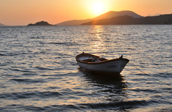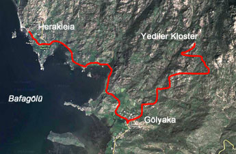 Wie oft waren wir auf der Strecke vom Flughafen Izmir zum Liegeplatz der ONEWAY in Bodrum an der Südseite des Bafa Gölü mit dem Auto vorbeigerauscht und hatten nur ab und zu einen schnellen Blick zur Seeseite gebenüber und dem hohen Gebirge dahinter aus dem Fenster geworfen. Ein paar Mal waren wir beim Restaurant unmittelbar an der Straße für eine Teepause links abgebogen. Dieses Mal hatten Harry und ich mehr Zeit als sonst und fragten Mehmet, den Inhaber, ob er ein kleines Hotel oder eine saubere Pension drüben in Herakleia empfehlen könne. "Mein Cousin Kubilay erwartet euch", grinste er, "Selenen's Pension in Kapikiri unterhalb von Herakleia am See". Er steckte uns eine Visitenkarte zu, "...und grüßt ihn von mir!" Es gab erstmal çay, dann schnappten wir uns die Kameras und wanderten am See entlang, dem Sonnenuntergang am Ufer entgegen. Friedliche Landschaft vor hohem Gebirge. Eine leichte Brise ließ die Boote schaukeln, ein weiß getünchtes Gästehaus war direkt auf den massiven Steinen einer alten, ganz offensichtlich antiken Steinmauer, erbaut. Der Abend senkte sich funkelnd über dem Wasserspiegel. Auf der Terrasse erwartete uns ein köstliches türkisches Abendessen. Kubilay servierte und stellte uns seinen jüngeren Bruder Tamer vor, der morgen Vormittag mit uns eine Wanderung zum Yediler Kloster im Latmos machen werde, so hatte er jedenfalls beschlossen.