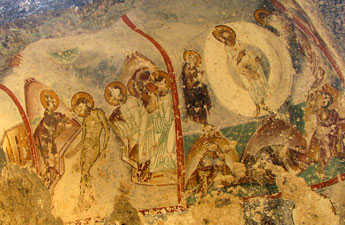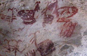 In der Höhle war es zunächst kühl und dunkel, dann gewöhnten wir uns ans schwache Licht und erkannten auf der Wand seltsame rötlich-blasse Figuren. Das seinen prähistorische Höhlenbemalungen aus der Zeit um 8. bis 4. Jahrhunderts v. Chr. Seit Mitte der 90er Jahre seien in der Gegend um die 170 solcher Felsmalereien entdeckt worden. Sie zeigten in einer Art von Strichmännchen mit Kopfputz und überlangen Körpern und stummelartigen Beinen, wohl Götter oder götterähnliche Wesen, die am Latmos verehrt wurden. Der Name Baliktas für diese Höhle bedeute Fischstein, erklärte Tamer. Die Künstler hätten die Farben mit ihren Fingern aufgebracht. Unglaublich, dass alles noch heute zu erkennen ist.