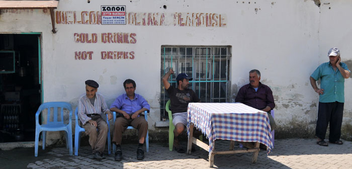 Der Rückweg ging in die Beine, die Knie wackelten, die Augen suchten sicheren Tritt. Unterwegs stolperten wir beinahe über eine Schildkröte, die den Kopf einzog als wir uns über sie beugten. Im Schatten eines Olivenbaumes erzählte uns Tamer wie die Adler des Latmos Schildkröten jagen. Sie packen sie mit ihren Krallen, erheben sich mit ihnen hoch in die Luft, öffnen oben die Klauen und lassen sie herunter fallen. Auf dem Fels zerschellt die schützende Schale der armen Turtle, und der Adler kann sich über sie her machen. "Seither haben Schildkröten Flugangst," stellte Harry lakonisch fest. Endlich kamen wir wieder in Gölyaka an. Vor dem Teehaus fielen wir in die Plastikstühle, Tamer ludt zum Tee ein, der köstlich schmeckte. Die Männer, die gelangweilt herumsaßen, wurden munter, nickten uns freundlich zu und ließen sich von ihm alles erzählen, was er über uns wusste. 4 Stunden hatte unsere Exkursion gedauert. E s war schon ein bisschen anstrengend gewesen.
