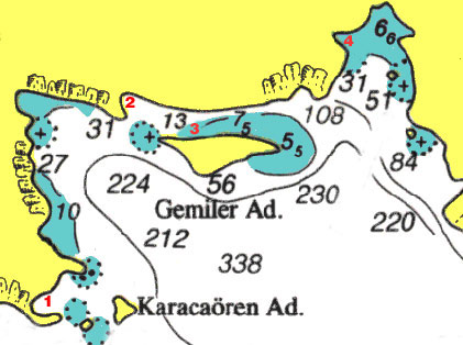 Beliebtestes Ziel vor Fethiye ist das Revier rund um die Insel Gemiler (Nikolaus-Insel) bei Ölüdeniz. Hier hat man vier Ankerplätze zur Wahl: 1. Hinter dem Ruinen-Inselchen Karacaören. 2. Bei "Robinson" (kleine runde Bucht gleich westlich von den rostroten Klippen, 500 m nordwestlich des Westkaps von Gemiler Adasi). 3. Im Kanal zwischen Gemiler und dem Festland. Und 4. im Bestas Limani, einer Nische in der tief nach Norden einschneidenden Bucht nordöstlich der Gemiler Insel. An hochsommerlichen August-Tagen ist im Kanal von Gemiler Adasi (Ankerplatz 3) oft kein freier Anlegeplatz zu finden. Burschen aus den Restaurants der Robinson-Bucht bieten Leinenhilfe an. Wer das Bedürfnis hat zu wandern, kann von Bestas Limani (Platz 4), eine Bergtour zum verlassenen Griechendorf Kayaköy machen (eine knappe Stunde). Allerdings bekommt der Wirt des Restaurants in Bestas Limani die gelbe Karte, weil er mit seinem Speedboot röhrend zwischen den ankernden Yachten herumbrettert und nicht nur akustisch stört, sondern auch für Schwimmer gefährlich manövriert.