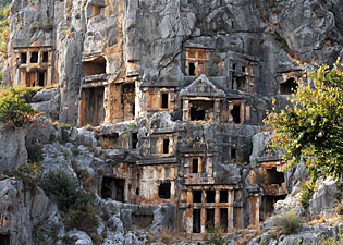 Über Demre (Kale), Zentrum des türkischen Gemüseanbaus in riesigen Gewächshäuserhalden, kommt man nach Myra, einst bedeutende lykische Stadt. Außer dem großen römischen Theater sind vor allem die Felsengräber sehenswert, die dicht übereinander gestaffelt in die steile Felswand gemeißelt und reich mit Reliefs und Figuren geschmückt sind. Das antike Theater ist vor allem wegen seiner wunderbaren Masken in Stein sehenswert.