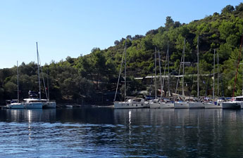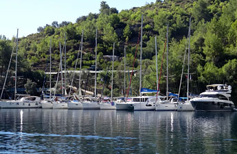 Für einen kurzen Stop kann man am Steg bei den Quellen fest machen oder davor ankern. Sicherheitshalber sollte man eine Landfeste ausbringen, da es recht schnell ziemlich tief runter geht. Der Platz ist schön, wird aber häufig von Tagesausflugsbooten angelaufen. Von den beiden gefassten Quellen spendet eine das ganze Jahr über frisches, aber nicht trinkbares Wasser. Bisher sind in der Bucht noch keine rote Festmachertonnen ausgelegt und keine roten Poller am Ufer installiert. Panorama: klick