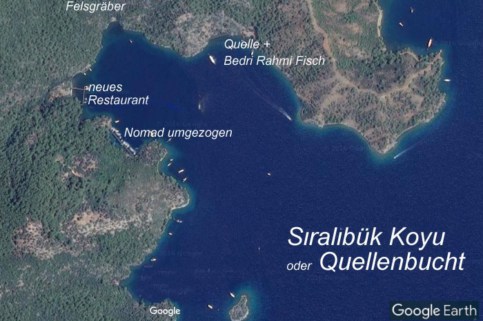 In dieser Bucht hat es im Sommer 2016 eine Veränderung bei den Stegretaurants gegeben. Das bisherige NOMAD-Restaruant im südwestlichen Scheitel der Bucht ist einen Einschnitt weiter nach Süden verlegt worden. Am alten Platz hat sich Yusuf Ikizoglu mit seinem neu gegründeten DALAMAN TASYAKA KOYU YAT MOLA NOKTASI etabliert. Gehen wir mal davon aus, dass ihm bis zum nächsten Saisonbeginn eine kürzerer und merkfähiger Name einfallen wird. Geplant ist für 2017 ein neuer Schwimmsteg und ein total renovierter Platz. Wir dürfen gespannt sein.