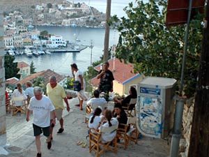 8.1.2006 Achtung: Die Hafenpolizei ist 2006 umgezogen und residiert jetzt auf der Südseite der Hafenbucht in einem der ersten Häuser von See her, erkennbar an der griechischen Flagge (11.10.06) ![]() ... im Hochsommer ist oft nur schwer ein Platz zu finden! Die griechische Insel Symi ist ein Kleinod unter den Inseln des Dodekanes. Jeder, der schon einmal in diesem zauberhaften Hafen eingelaufen ist, wird sich immer wieder gerne daran erinnern. Nur 4 Seemeilen trennen diese griechische Insel von der türkischen Küste. Weder die Türkei noch Griechenland können in dieser Ecke der Ägäis die Hoheitsgewässer in voller Breite für sich beanspruchen. Von Rhodos-Stadt ist Symi eine kleine Tagesetappe von 20 Seemeilen entfernt, die allerdings, wenn der Meltemi nachmittags durch die Rhodosstraße mit bis zu 7 Bft. fetzt, zu einer harten Aufkreuzerei werden kann. Symi ist sowohl als Schwammtaucherinsel als auch als Insel der Werften bekannt gewesen. Hier wurde ein besonders widerstandsfähiger Schiffstyp gebaut, der schon in der Antike sehr geschätzt war und später sowohl von den Johannitern als auch von den Türken eingesetzt worden ist. Sie gehörten zu den schnellsten im Östlichen Mittelmeer. Auch am Trojanischen Krieg waren die Symianer beteiligt. Im Schiffskatalog der Ilias führte Homer sie mit drei Galeeren auf. Die Geschichte der Insel Symi geht viele Jahrtausende zurück. Auf Symi sollen die drei Grazien geboren worden sein. Der Name kommt von der Nymphe Syme, der Frau des Poseidon. In der Blütezeit hatte Symi um die 20.000 Einwohner (heute nur noch ca. 2.800). Im Laufe der langen Geschichte wurde die Insel von den unterschiedlichsten Besatzern regiert, von den Kreuzrittern wie von den Osmanen. Während der osmanischen Besetzung, durften die Symianer eifrig ihren Handel treiben. Die Schiffe, die erfahrenen Seemänner, das Brot welches hier gebacken wurde, der Fischfang und die Schwämme waren für die Türken bei der Belagerung von Rhodos sehr wichtig. Das brachte den Einwohnern der Insel Privilegien, die ihnen halfen, die schweren Zeit besser zu überstehen. 1912 eroberten die Italiener die Insel und blieben bis 1948. Mit den Dampfschiffen ging die Blütezeit Symis wie auch die Kastellorizons zu Ende. Das Leben auf der kleinen Insel begann zu verarmen, viele Symianer gingen nach Rhodos, aufs griechische Festland, nach Amerika oder Australien. Heute leben die, die geblieben sind oder zurück kamen, vom Tourismus. Symis Architektur ist nicht typisch griechisch. Geprägt durch italienische Vorbilder, sind die Häuser in malerischen Pastellfarben angestrichen und geben dem Ort sein besonders im Abendlicht, wunderbar strahlendes und leuchtendes Aussehen.