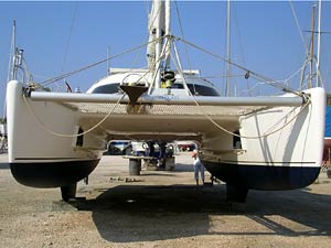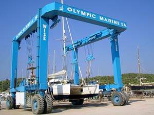 Irgendwann führte uns unser Ägäis-Zickzackkurs über die Kafireas-Strasse zum Festland, weil wir dort unsere Kinder erwarteten. Der Wassereinbruch im Getriebeöl wurde immer heftiger und trotz permanentem Ölwechsel war der Zustand nicht mehr haltbar. Also ab zur Olympic Marina bei Lavrion (der einzig große Lift in der Nähe). Boot raus - man gönnt sich ja sonst nichts und auf dem Wasser waren wir lange genug. Welle ausgebaut und siehe da, die Welle hatte Riefen. Die beiden hintereinander liegenden Simmeringe waren auf der Welle eingelaufen und da drückte logischerweise das Wasser rein. Prophylaktisch vom anderen Saildrive auch die Welle ausgebaut und auch dort waren anfängliche Einlaufriefen sichtbar. Neue Wellen waren in absehbarer Zeit in GANZ EUROPA nicht aufzutreiben (Yanmar) und aus Japan dauerte es zu lange, die Kinder kamen ja bald und die wollten segeln. In Athen gab es glücklicherweise eine Feinmechanikerwerkstatt, die solche Reparaturen durchführten. Beide Wellen wurden durch mehrfachen Materialauftrag und mehrfachem Abschleifen wieder auf Vordermann gebracht. Wir nutzten die Wartezeit mit Antifoulingstreichen, denn dann könnten wir uns das Anlandstellen im kommenden Winter ersparen. Nach dem Einbau der Wellen ging es ruckzuck wieder ins Wasser und nach Porto Rafti (Flughafennähe) um Almuts Sohn abzuholen. Die Liftleute waren chaotisch und dilettantisch!