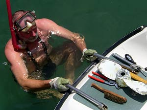 Es gab 2 Möglichkeiten, entweder die beiden Simmeringe, die die Welle zum Meerwasser hin abdichten, oder die Ölablassschraube. Eigentlich muß dafür das Boot an Land, aber da wir so wieso im Winter rauswollten, versuchte ich mit allen Mitteln die Reparatur hinauszuzögern. Also pumpte ich laufend Getriebeöl von innen ab - max. 50% waren nur möglich - und füllte neues Öl nach. Auf diese Weise konnte ich die Ölqualität auf einem halbwegs guten Level halten.