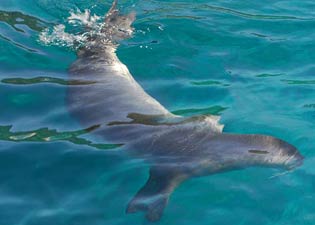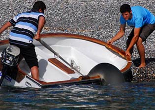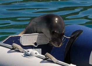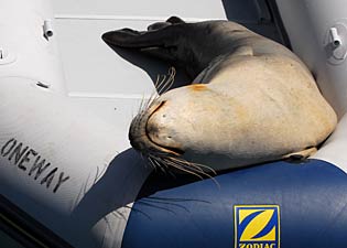 Badem liebt Dingis über alles Donnerstag, 22. Mai 2008, Bucht von Alakisla vor dem Strand der byzantinischen Ruinen Am Morgen um halb neun plötzlich ein großes Hallo auf der Gulet Caner II: Badem, die Seerobbe (siehe diese Seite) hat im Dingi der Gulet übernachtet und wird entdeckt, als sie den Kopf über die Kante reckt. Holla, da ist aber was los...