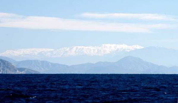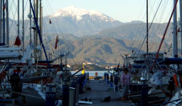 Elkes Wintergeschichte 2 - Blaue See und weißer Schnee von Elke Le Grand Bleu Den einzigen schönen Tag, der sich zwischen Gewitter und Regen quetscht, nutzen wir, um von Marmaris nach Fethiye zu segeln. Die Sonne strahlt, der wenige Wind lässt uns keine Wahl: Vollzeug ist angesagt, um überhaupt voran zu kommen. Gross hoch, Genua raus, so dümpeln wir gen Südost und fragen uns die ganze Zeit, ob wir nicht doch den Spinnaker auspacken sollten. 40 Seemeilen liegen vor uns, trotz frühem Start drängt die Zeit, damit wir noch im Hellen in eine Bucht einlaufen können. Doch schon bald nimmt uns Rasmus die Entscheidung ab. Faul, wie er ist, legt er sich ganz schlafen. Der Jockel muss ran, die See ist glatt wie ein Spiegel. Ohne Wind wird es so warm, dass wir Anfang Dezember im T-Shirt im Cockpit sitzen. Doch dann trauen wir unseren Augen nicht, als wir voraus Schneeberge zu erkennen glauben. Oder sind das nur die Wolken? Immer näher kommen wir, dann können wir tatsächlich das Weiß auf den Bergen als Schnee erkennen. Brrrr, schnell noch einen Fleecepulli überziehen...