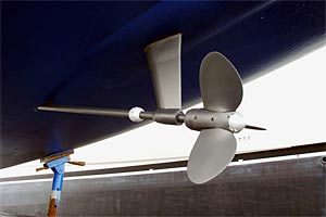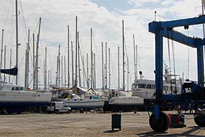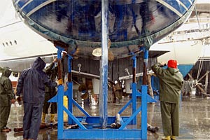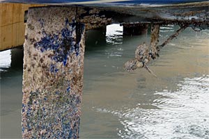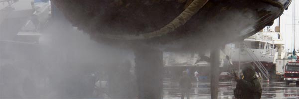 Noch in den Gurten hängend bekommt unsere Dicke eine "Unterbodenwäsche" verpasst. Die Profis mit den Hochdruckreinigern blasen fast den gesamten Bewuchts fort. Wir treten gern ein paar Meter beiseite, denn der Wasserdruck ist so hoch, dass die beiden Arbeiter total im Nebel stehen. Nass sind wir immer noch, denn an Bord zum Umziehen kommen wir erst, wenn das Schiff sicher aufgepallt ist. Der Kran fährt das Schiff zu dem Metallgestell, das die Hauptlast tragen soll. Noch immer regnet es Bindfäden. Die Stützen sind fast zu kurz für unseren Tiefgang, das letzte Loch muss für den Splint herhalten. Das ganze sieht ganz schön x-beinig aus, das Kranteam guckt skeptisch. Kaum steht die ganze Chose zwischen zwei riesigen Motorbooten, schon kommen viele Baumstämme angefahren. Sage und schreibe sechs zusätzliche Stützen schlagen die Männer am Bug und am Heck, backbord und steuerbord unter den Rumpf. Das wirkt schon viel vertrauenswürdiger. Nun bekommen wir noch eine lange Leiter, die wir an unserer Badeleiter am schrägen Heck anlegen. Zwei dicke Tampen halten sie an ihrem Platz. Das ist auch nötig, denn wir müssen an den nächsten Tagen ständig die 3 1/2 Meter lange Hühnerleiter hoch- und runterklettern. Auch beim Arbeiten geht nix, aber auch gar nix ohne Gerüst. Die 2,60 Meter Tiefgang plus ein paar Zentimeter Metallbock können wir auch mit den allerlängsten Armen nicht überwinden. So klettern wir dann Gerüst rauf, Gerüst runter, verschieben die schweren Metallteile am Rumpf entlang und schimpfen über unsere Knie, die sich nach der zigsten Klettertour partout nicht mehr beugen wollen. Dank der guten Vorarbeit beim "Kärchern" müssen wir nur noch die hartnäckigsten Seepocken per Hand abkratzen. Ansonsten sieht der Rumpf ganz gut aus. Trotzdem kostet uns das Anschleifen per Hand zwei lange Tage. Wenigstens Rasmus meint es jetzt gut mit uns, die Sonne strahlt und lässt uns kräftig schwitzen bei der harten Arbeit. Den Schleifstaub waschen wir mit Süsswasser ab, lassen den Rumpf richtig trockenen und raffen uns abends noch zum Abkleben der Wasserlinie mit Maskentape auf.