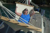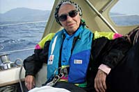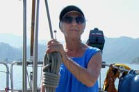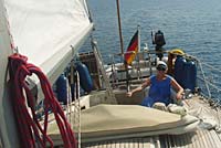 Nicht die großen Dinge sind es, die ein Abenteuer ausmachen, manchmal sind es die unscheinbaren Kleinigkeiten, die zum Abenteuer werden. Skippers Mahnung im Ohr rückwärts die Treppe runter zu gehen, ist zunächst ungewohnt. Dazu der Zuruf "Immer schön festhalten - eine Hand fürs Schiff, die andere für die Frau...", verunsichern Hildegard zunächst. Doch beim dritten Mal ist es bereits Routine. Der erste Versuch, die Schiffstoilette zu benutzen, wird für Hildegard zu einem echten Abenteuer. Ventile öffnen, mit der Hand pumpen, kein Papier in die Schüssel, Ventile schließen, das alles ohne Druckspülung wie zuhause und auf engstem Raum. Bei Schräglage die Treppe wieder rauf klettern, und dann, wenn es noch mehr schaukelt, zum Horizont gucken, "das hilft", sagt der Skipper. Und niemals nicht pfeifen (Hildegard lacht). Und auf jeden Fall immer Ausschau halten, es könnten ja irgendwo Delfine auftauchen. Vieles ist ungewohnt: Es gibt nur einen kleinen Spiegel an Bord, und der hängt in der Nasszelle. Hildegard ist es gewohnt, immer schick gekleidet und frisiert die Wohnung zu verlassen. Sie schaut erst skeptisch, kommt dann aber jeden Morgen wie aus dem Ei gepellt ins Cockpit. Als der Skipper zwischen Symi und Bozburun bei Windstärke 5 dazu auffordert, die Schwimmwesten anzulegen, lacht Hildegard spitzbübisch: "Das kenne ich, das ist wohl eine Übung wie auf dem Traumschiff im Fernsehen!" Sie merkt aber schnell, dass es dem Skipper ernst ist und zieht sich die Weste über. Angst habe sie keine, sagt sie, aber damit habe sie nicht gerechnet. Hinterher ist sie stolz, dass sie die moderate Windstärke gut überstanden hat. Von Seekrankheit hat sie überhaupt nichts gespürt.