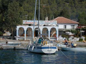 Bei Einbruch der Dunkelheit werden die Yachties von Ibrahims Sšhnen mit dem Tuckerboot abgeholt und zum Pistolentanz (nicht mehr immer) und Wasserpfeiferauchen in den Restaurantgarten gebracht (ab Mai bis Ende September). Es gibt Fisch oder Hühnchen aus dem gemauerten Ofen. Einfach, aber gut. Meist geht die Stimmung hoch. Vor allem wenn Ibrahim sich in seine alte osmanische Soldatenuniform schmeisst, zur Dorfmusik tanzt, mit Platzpatronen in die Luft schiesst und der jüngste Sohn ein gackerndes Huhn vom Dach des Hauses auf die Gesellschaft herunterflattern lässt. Zum Frühstück bringt Ibrahim auf Wunsch frisches Brot und Melonen zur Yacht. Wem der Platz zu turbulent ist, der ankert gleich westlich nebenan in der Bucht Kargili. Entweder frei vor dem Strand mit genügend Abstand oder mit einer langen Leine zu einem der Olivenbäume am Strand. Wenn frei geankert wird, den Drehkreis berücksichtigen, der Wind kann auf Süd drehen! Man hört nichts anderes als Zykadenlärm und den Schrei des Esels zwischen den Olivenbäumen. Achtung: Nicht nackt baden! Die unsichtbar zwischen Johannisbrot- und Mandelbäumen arbeitenden Dorfbewohner könnten Anstoss nehmen; wir sind in einem islamischen Land. Dies gilt überall da, wo nicht absolute Einsamkeit ist. Ein beschaulicher Platz war bis vor wenigen Jahren die Kleopatra-Insel, in der Seekarte Sehir adalari, im hinteren Teil des Golfes. Den Korallensand hat angeblich Mark Anton der Königin von Ägypten als Hochzeitsgeschenk vor die Füße gekippt. Die ehemals geheimnisumwitterte Insel ist längst entzaubert. Der Strand wurde von "cleveren" Tourismus-Managern entdeckt und vermarktet. Stündlich laufen Ausflugsboote vom nahen Ufer zur Insel. In der Mitte der Hauptinsel rattert ein Diesel, um in der Getränkebar Cola und Bier zu kühlen. Wer trotzdem den sagenumwobenen Sand vom Roten Meer durch seine Finger gleiten lassen will, kommt am besten vormittags gegen neun, ankert auf 5 bis 6 m in der Bucht, pullt an Land und segelt, wenn der Hauptansturm beginnt, wieder davon. Nachts gilt Ankerverbot. Wichtig: Keinen Sand mitnehmen, auch keine antiken Mosaiksteine, Scherben, Amphorenteile o. ä. Nirgendwo in der Türkei! Die Gefängnisse sind keine Hotels. Siehe dazu dies: klick Die Einfahrt erfolgt von Westen durch den südlich gelegenen Zufahrtskanal zwischen der Insel und dem Festland. Man fährt dann hinter der Insel nach Nord und steuert dann nach West in die Bucht hinein. Die Ausfahrt am besten unter Motor über den gleichen Kurs. Westlich der Hauptinsel liegt eine gefährlich Untiefe mit einer Markierungsboje.
