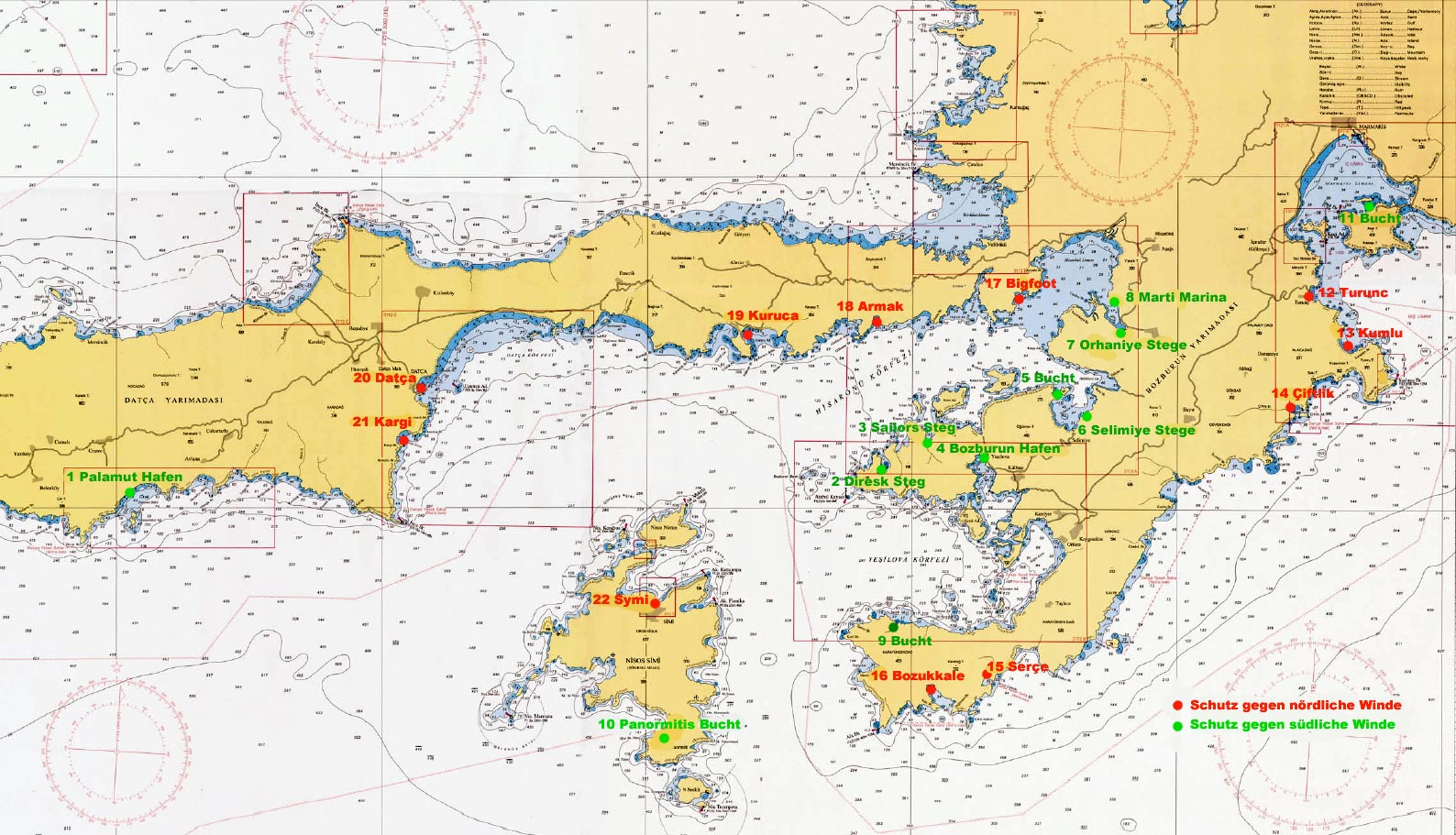 Hier zunächst die Buchten und Häfen (grün auf der Karte), die Du bei Südwind ansteuern kannst. Nur diese, von allen anderen rate ich ab. Die sind nicht alle unbedingt die schönsten, aber u.U. die nützlichsten... Ich schreib Dir das nicht, um Dich zu belehren, sondern weil ich aus Erfahrung weiß wie schnell Crews an diesem Abschnitt in Schwierigkeiten kommen können.