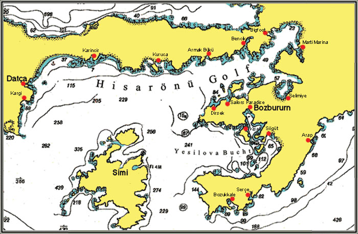 An manchen Hochsommertagen, wenn der Meltemi die türkische Küste erreicht und durch die Düse der Straße von Kos verstärkt über die flache Datçahalbinsel in den Hisarönügolf hineinfegt, kann es am Nachmittag heftig werden. Dann sollten wir rechtzeitig reffen und eine schützende Bucht anlaufen, die möglichst an der Nordseite des Golfes liegt und nicht an der Südseite. Segeln wir früh im Frühjahr oder später im Herbst müssen wir mit dem letzten oder - im Herbst - mit dem ersten Südostwind (Lodos) rechnen. Dann sind die Buchten der Südküste des Golfes die sichereren Plätze.