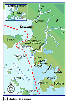 Kusadasi liegt in einer weiten, nach Westen offenen Bay. Nördlich der Stadt öffnet sich die Ebene, die der Strom Kleiner Mäander" mit Sand und Schlamm aufgefüllt hat und so dem antiken Ephesus die Hafenzufahrt verlandete. Weitere Ergänzungen zu dem folgenden Törn siehe auch Insider-Törntipp Bodrum-Golf von Güllük.